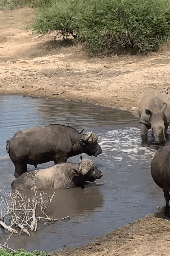 This backup turns the tides in the rhino’s favor, and one of the buffalo gets out of the water in a hurry. No doubt it could see how the following encounter might turn sour, and it wanted to make sure it was a safe distance away.