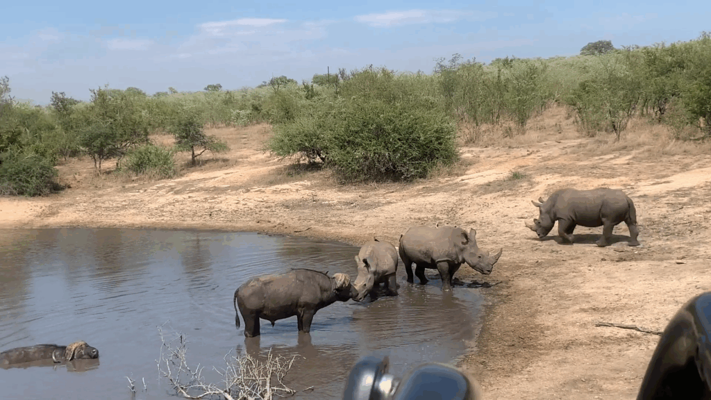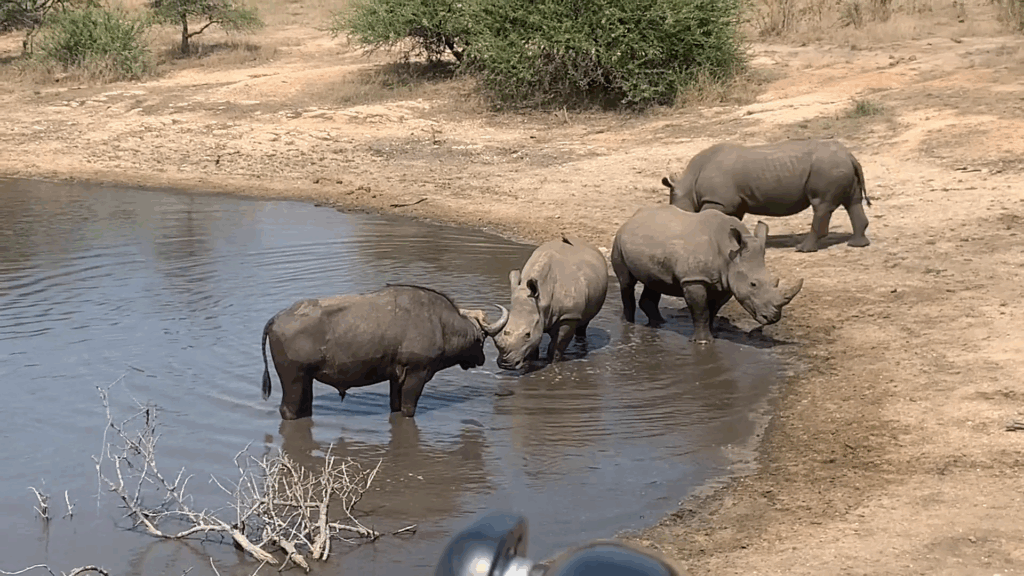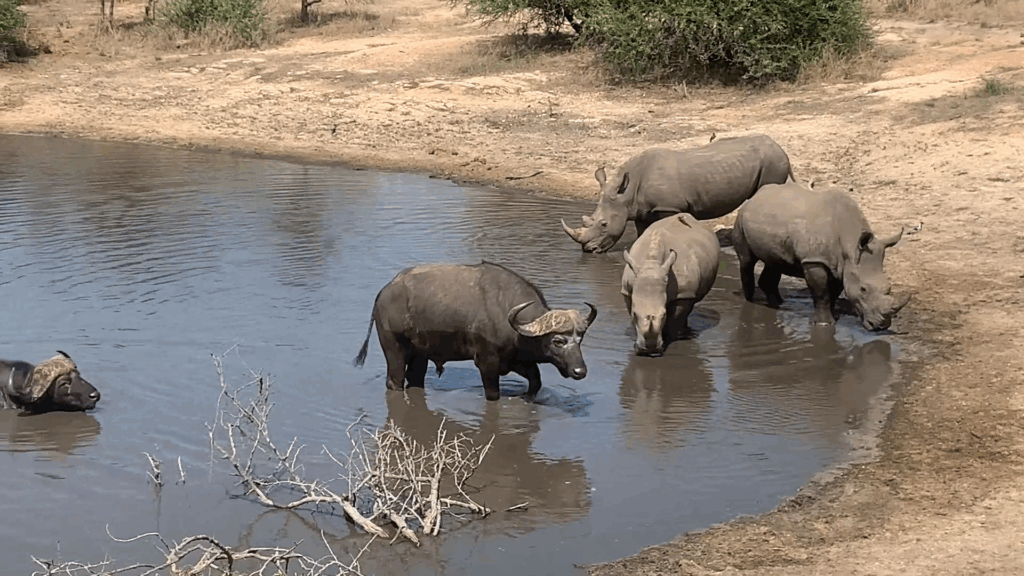 This rhino’s first attempt to secure the area of water for itself had met with failure. One small rhino couldn’t scare the buffalo, but the two larger adults that joined it might prove more persuasive.