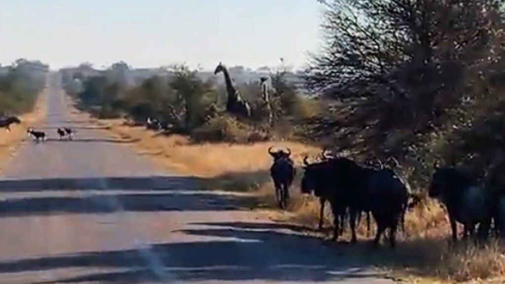 In a humorous moment, even the giraffes appeared to join in. They could be seen running in the distance towards the wild dogs, along with the wildebeest. One of the game viewers could be heard exclaiming, “Look, even the giraffes…”