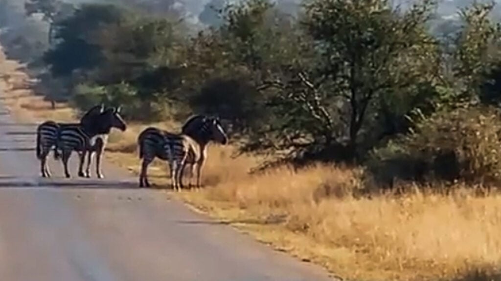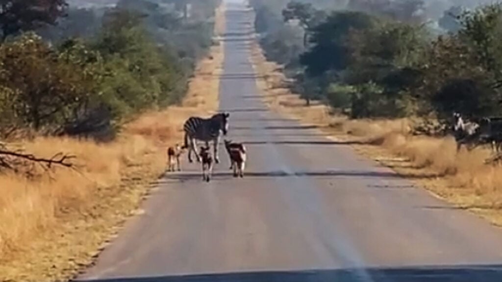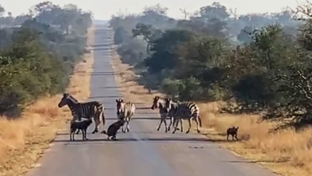 Some of the wild dogs snapped at a zebra, which stood sheepishly in the road. However, it soon became evident the rest of the zebra weren’t about to take the dogs’ attempts at a confrontation lying down.