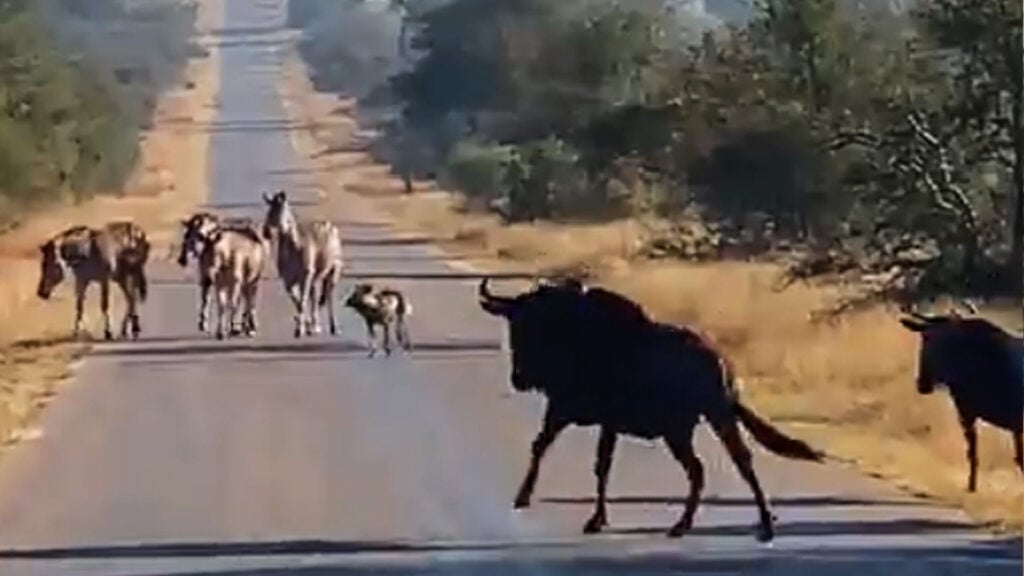 The wild dogs responded to their unified approach by moving out of the way, however, not without retaliation.