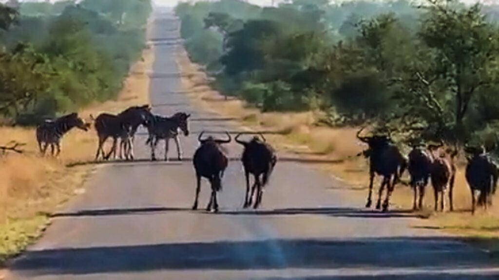The wild dogs decided this possibly wasn’t the time to retaliate, and started to run off the road, disappearing into the bushveld. They were followed by the full herd of wildebeest.